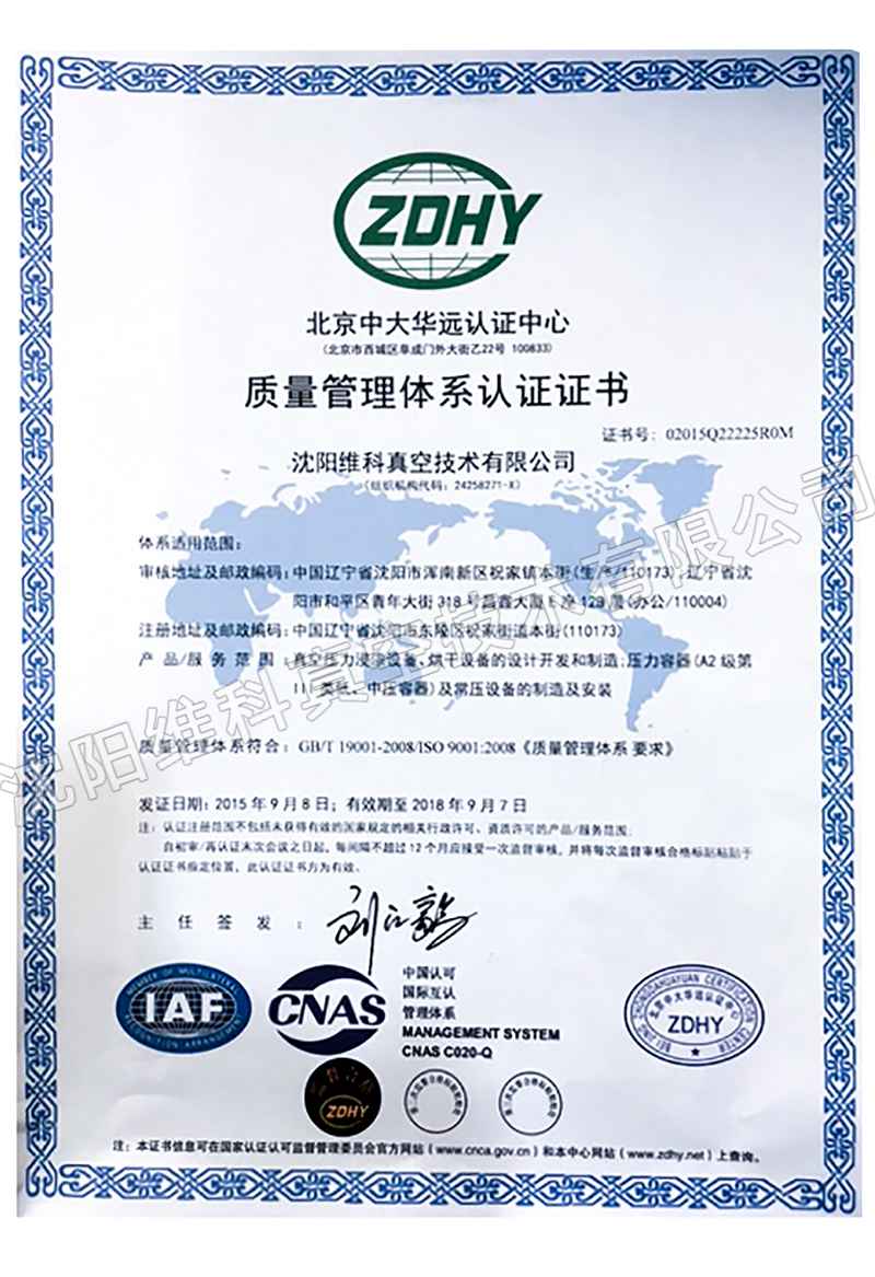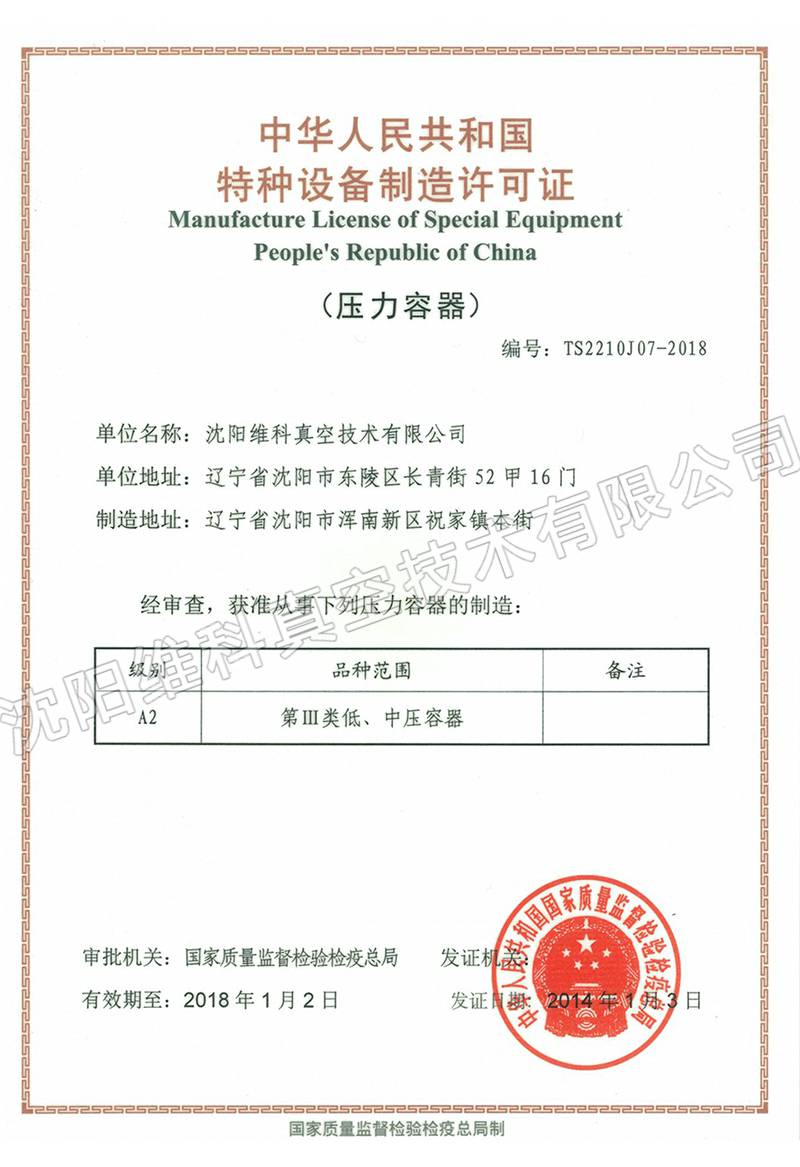 维科公司具有国家颁发的AII级压力容器制造许可证及省级鉴定的压力容器安全连锁装置制造资质,获得IS09001质量认证。