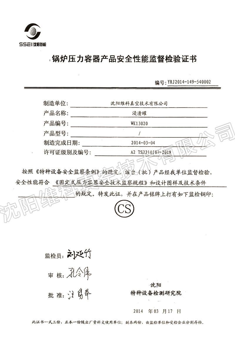 设备主要零部件均采用良好的材料制造;所选用的机械、压力、真空、液压、电气、电子元件都是良好的、可靠的。浸渍罐按压力容器要求规范设计、有限元计算、比较完整的质量体系、专业制造及检测,并由检测部门提供产品合格证。