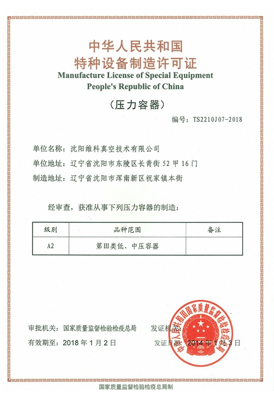 中华人民共和国特种设备制造许可证